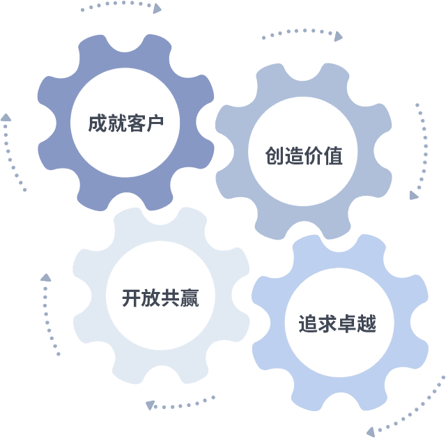 成就客户是一切决策的出发点,,,,创造价值是衡量所有工作的标准,,,追求卓越是九游会做事做人的态度,,,,开放共赢是九游会的格局也是最终的结果。。。。价值观的齿轮环环相扣,,推动着组织里的每个人不断向前。。